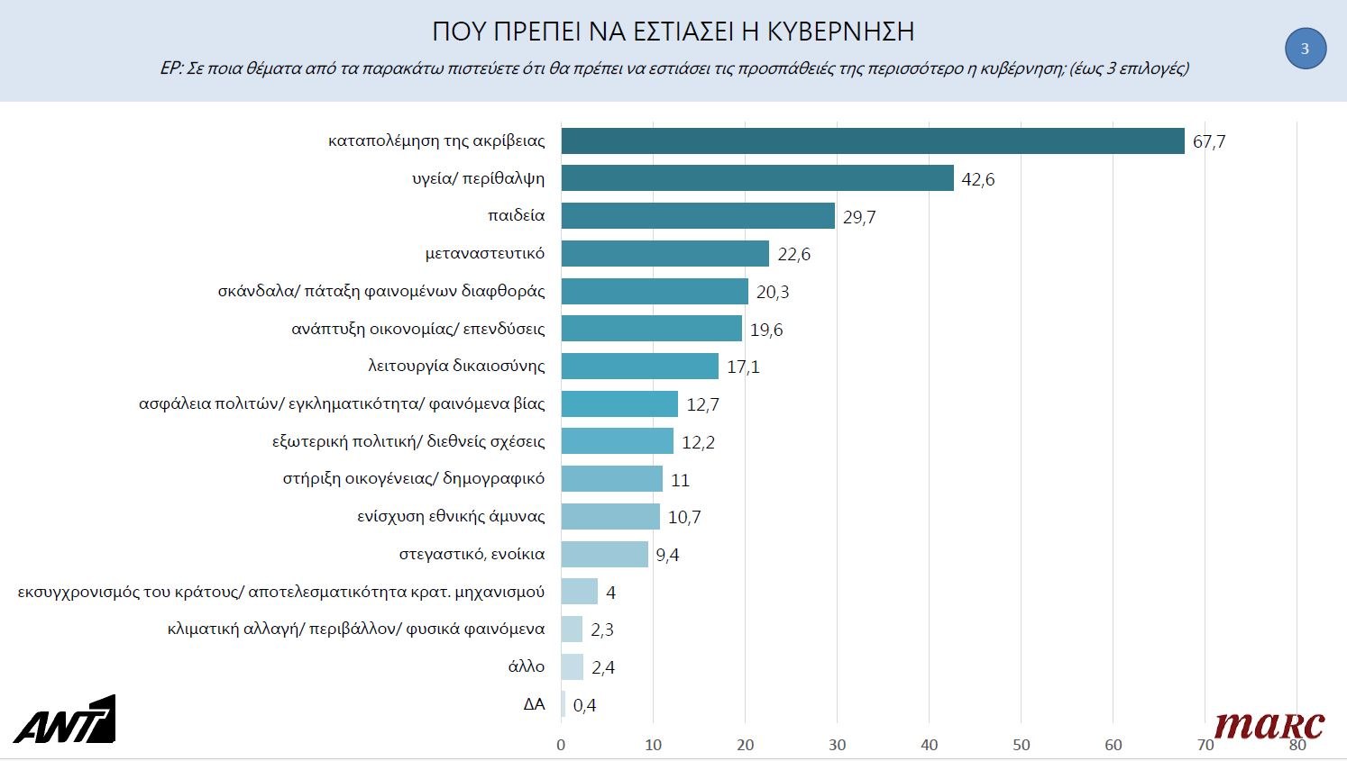 Στο ερώτημα που πρέπει να εστιάσει η κυβέρνηση, η πλειοψηφία των πολιτών απάντησε στην καταπολέμηση της ακρίβειας κι ακολούθησε η υγεία/περίθαλψη.
