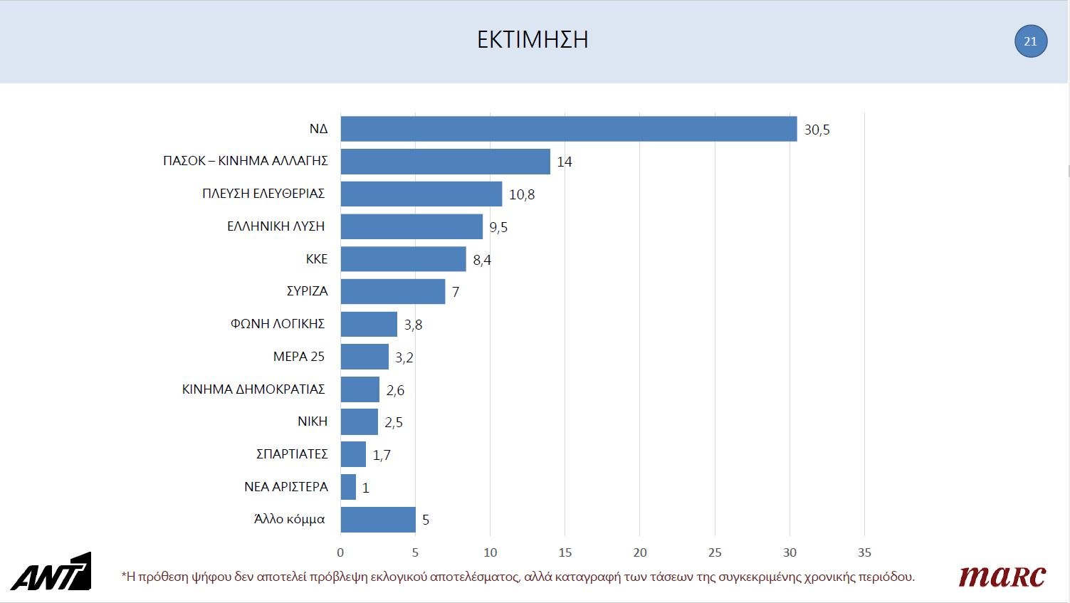 Στην εκτίμηση ψήφου, φαίνεται 8 κόμματα να μπαίνουν στη Βουλή. Η Νέα Δημοκρατία «οδηγεί την κούρσα» με απόσταση «ασφαλείας» από το δεύτερο ΠΑΣΟΚ. Πλεύση Ελευθερίας και Ελληνική Λύση βρίσκονται σχετικά κοντά στην τρίτη και τέταρτη θέση αντίστοιχα. Ακολουθούν ΚΚΕ, ΣΥΡΙΖΑ, Φωνή Λογικής, ΜεΡΑ25, Κίνημα Δημοκρατίας, Νίκη, Σπαρτιάτες και Νέα Αριστερά.