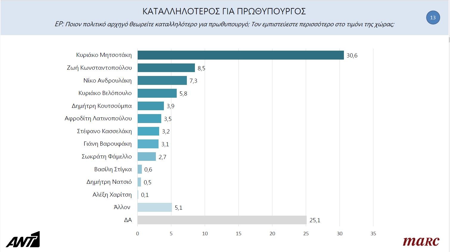 Αρχικά στο ερώτημα ποιος είναι ο καταλληλότερος για πρωθυπουργός, στην έρευνα της MARC, προηγείται με μεγάλη διαφορά ο Κυριάκος Μητσοτάκης, ενώ ακολουθεί η Ζωή Κωνσταντοπούλου, πάνω από τον Νίκο Ανδρουλάκη.