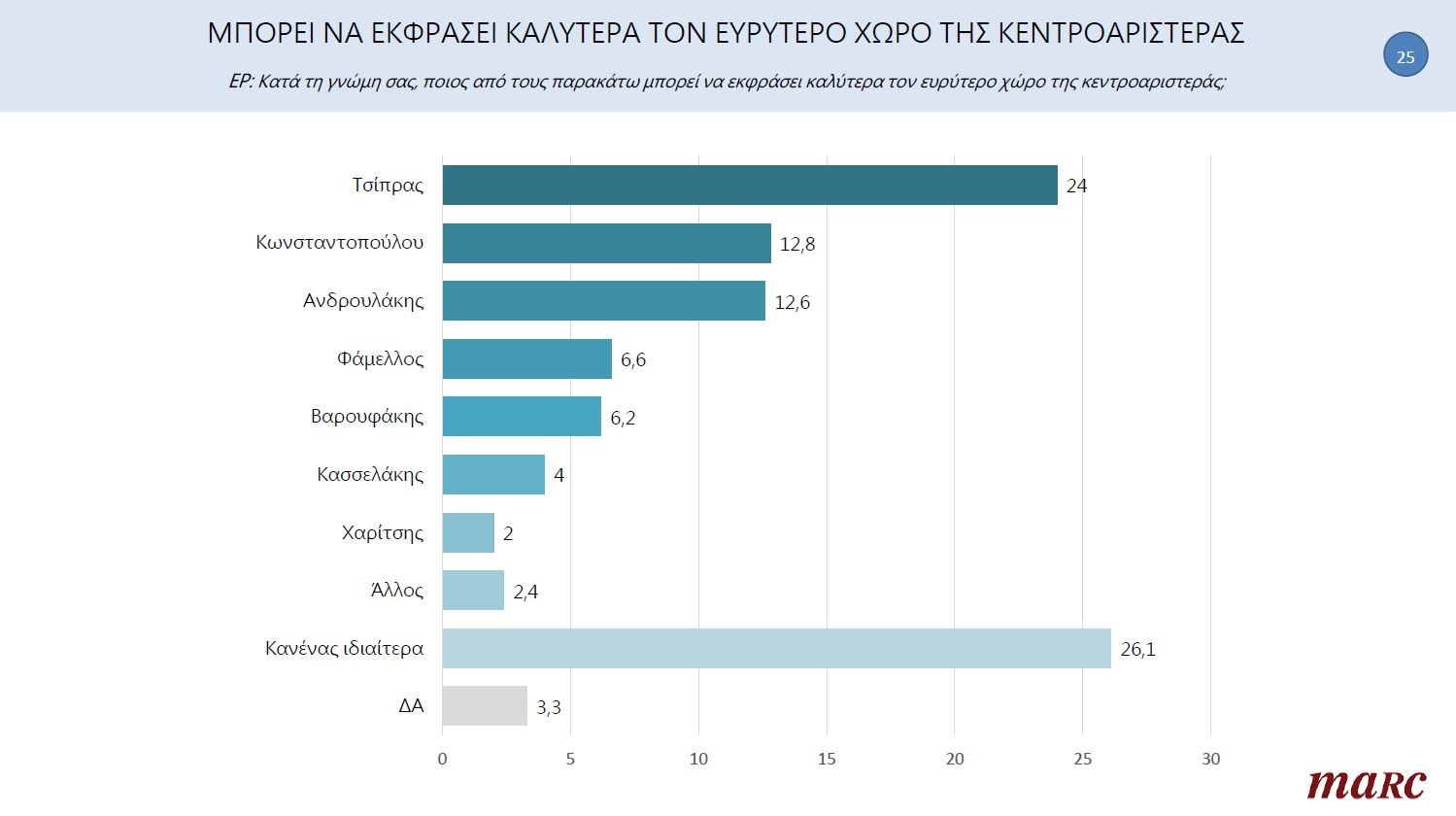 Η δυναμική επάνοδος του Αλέξη Τσίπρα στο εγχώριο πολιτικό σκηνικό πιστοποιείται και στο ερώτημα ποιος/α μπορεί να εκφράσει καλύτερα τον ευρύτερο χώρο της κεντροαριστεράς. Ο Αλέξης Τσίπρας είναι πρώτος και με διαφορά με ποσοστό 24%. Ακολουθεί η Ζωή Κωνσταντοπούλου με 12,8% και από κοντά ο Νίκος Ανδρουλάκης με 12,6%.