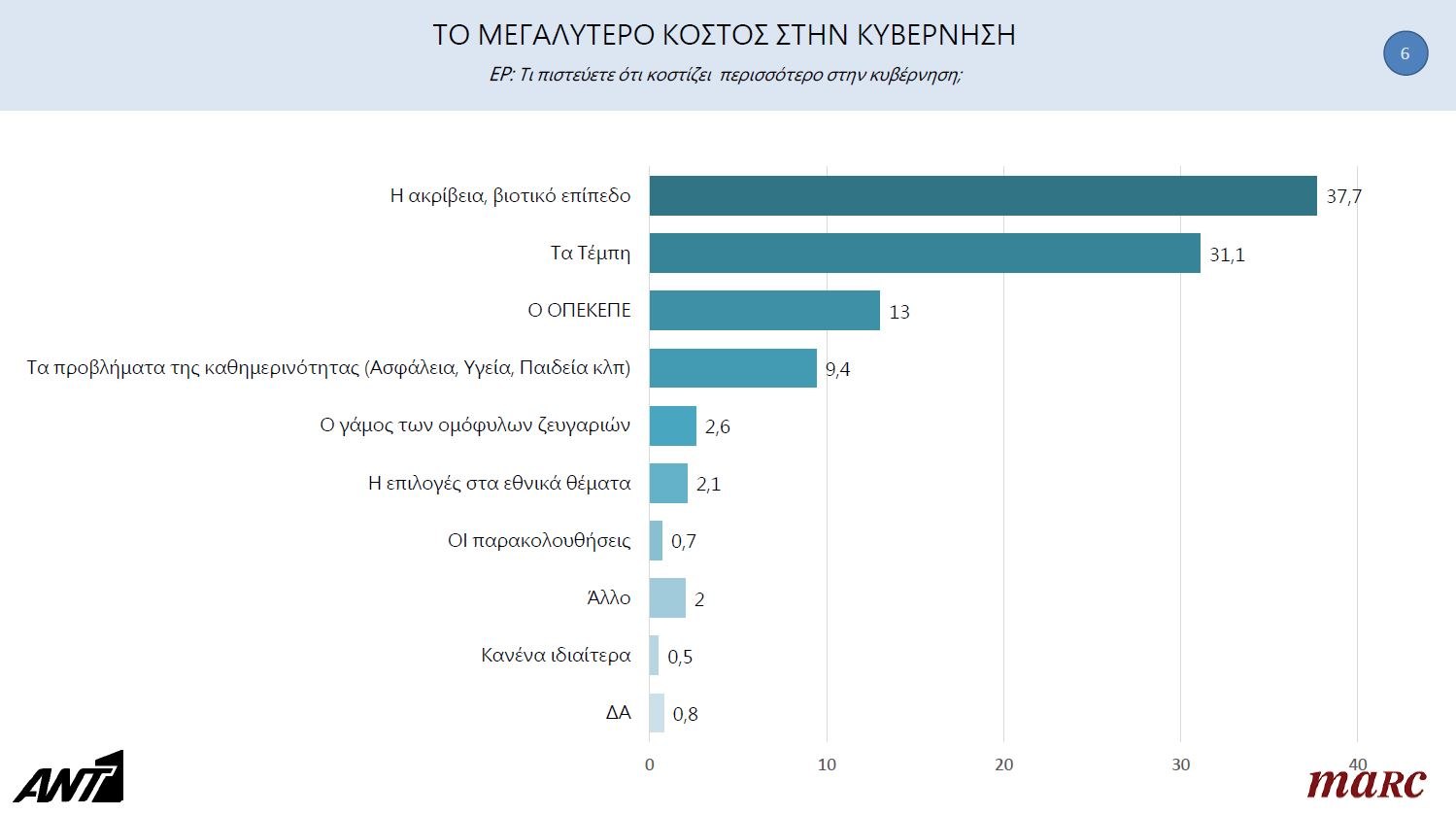 Στο ερώτημα ποιος τομέας έχει το μεγαλύτερο πολιτικό κόστος για την κυβέρνηση, οι ερωτηθέντες απάντησαν ότι ή ακρίβεια και το βιοτικό επίπεδο βρίσκεται στην κορυφή, ενώ ακολουθεί η τραγωδία των Τεμπών.