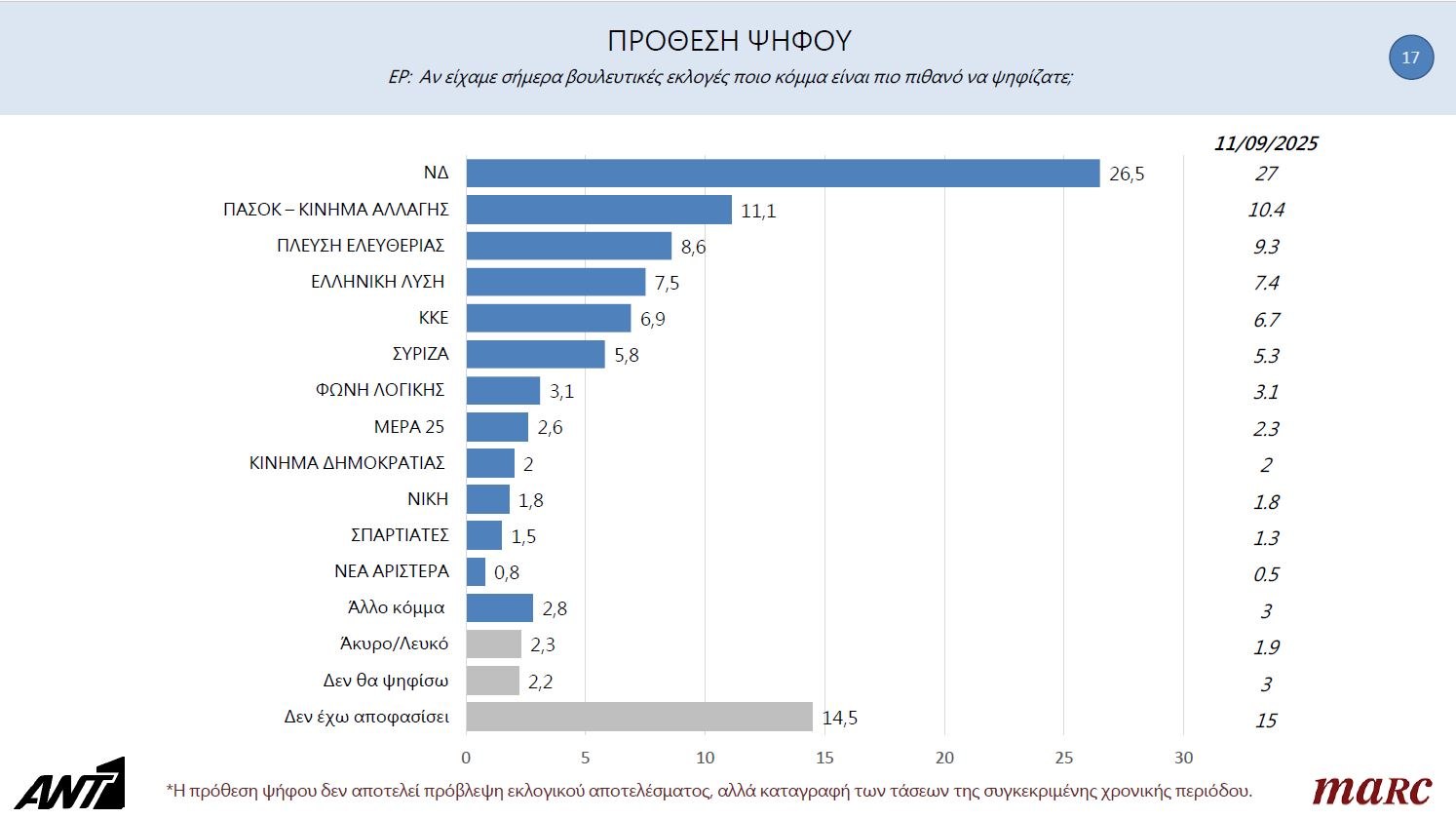 Στο ερώτημα της πρόθεσης ψήφου, η ΝΔ εξακολουθεί να προηγείται με μεγάλη διαφορά του ΠΑΣΟΚ που βρίσκεται στη δεύτερη θέση, αν και χάνει λίγο από τη δυναμική της σε σχέση με τη μέτρηση του Σεπτεμβρίου. Τρίτο κόμμα η Πλεύση Ελευθερίας και ακολουθούν Ελληνική Λύση, ΚΚΕ, ΣΥΡΙΖΑ, Φωνή Λογικής, ΜεΡΑ25, Κίνημα Δημοκρατίας, Νίκη, Σπαρτιάτες και Νέα Αριστερά.