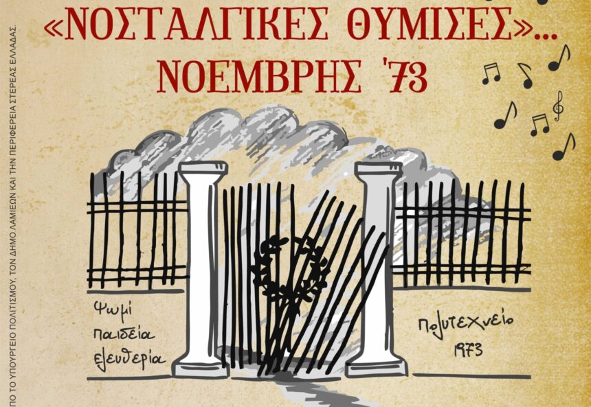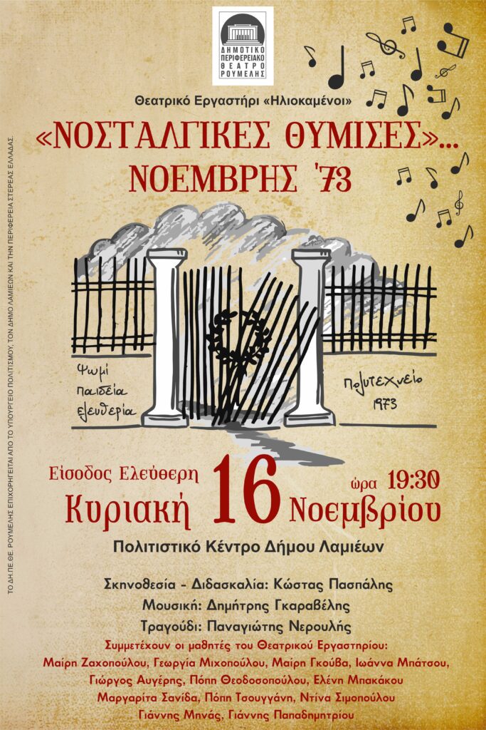 Το Δημοτικό Περιφερειακό Θέατρο Ρούμελης και το Θεατρικό Εργαστήρι «Ηλιοκαμένοι» παρουσιάζουν την θεατρική – μουσική παράσταση «Νοσταλγικές Θύμισες… Νοέμβρης ‘73», την Κυριακή 16 Νοεμβρίου, στις 19:30, στο Πολιτιστικό Κέντρο του Δήμου Λαμιέων, που βρίσκεται στην οδό Λεωνίδου 9-11.